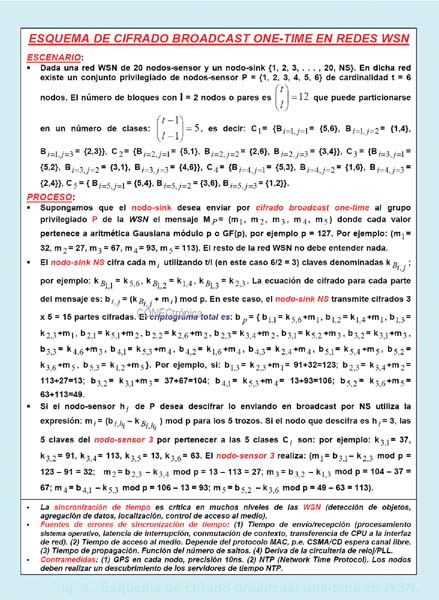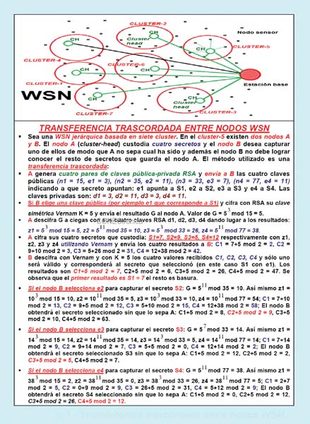 Las redes inalámbricas de sensores cada día van utilizándose en mayor número de escenarios, para realizar un creciente colectivo de tareas en mayor número de entornos. Una red inalámbrica de sensores o WSN es un sistema-red ad-hoc, multi-hop, autoorganizado, distribuido, no atendido, heterogéneo de dispositivos de computación autónomos miniatura que combina nodos-sensor de reducido tamaño y bajo costo (con limitaciones de fuente de alimentación/batería de energía, de ancho de banda de transmisión, de capacidad computacional/CPU y de memoria, de capacidad para resistir ataques físicos, etc.), nodos-sink/estaciones base, elementos de computación de propósito general, etc. Los nodos-sensor se pueden agrupar en un conjunto de clusters y cada cluster tiene un nodo que actúa como cluster-head (CH).