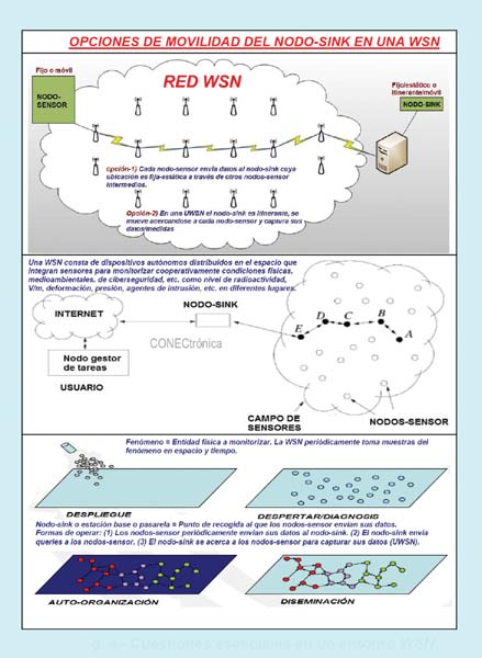 Todos los nodos-sensor reenvían sus datos al cluster-head que a su vez lo encamina a un nodo especializadodenominado nodo-sink a través de una comunicación inalámbrica multi-salto. Las WSN integran nodos-sensor, nodos-sink o estación base o puntos de agregación de confianza. La mayor parte de las WSNs constan de cientos o miles de nodos-sensor de bajo costo y baja potencia desplegados para monitorizar e influir en el entorno. Se utilizan diversas tecnologías de comunicación inalámbrica como Bluetooth, Zigbee/IEEE 802.14.5, WiFi-LiFi, WiMax, etc. Se utilizan para muy diversas aplicaciones como: smart-grid, vigilancia, logística, control de procesos, ahorro de energía, aplicaciones en medicina y cuidado de la salud (RWBSNs, Remote Wireless BioSensor Networks), aplicaciones industriales, agricultura de precisión, detección de desastres, militares (seguimiento del enemigo en guerras, protección de oleoductos, monitorización de actividad insurgente), monitorización medioambiental, seguridad de rascacielos-puntes, predicción-detección y monitorización de terremotos, de maquinaria industrial, de océanos, vida salvaje, automatización de hogares, control de luz/temperatura, gestión de activos (seguimiento de movimientos y almacenamientos), edificios inteligentes, AmI, business, etc. A nivel de red sus enlaces inalámbricos son inseguros (denegación de servicios, escuchas clandestinas, repetición e inyección de paquetes, etc.), sus nodos no suelen ser resistentes a la penetración.