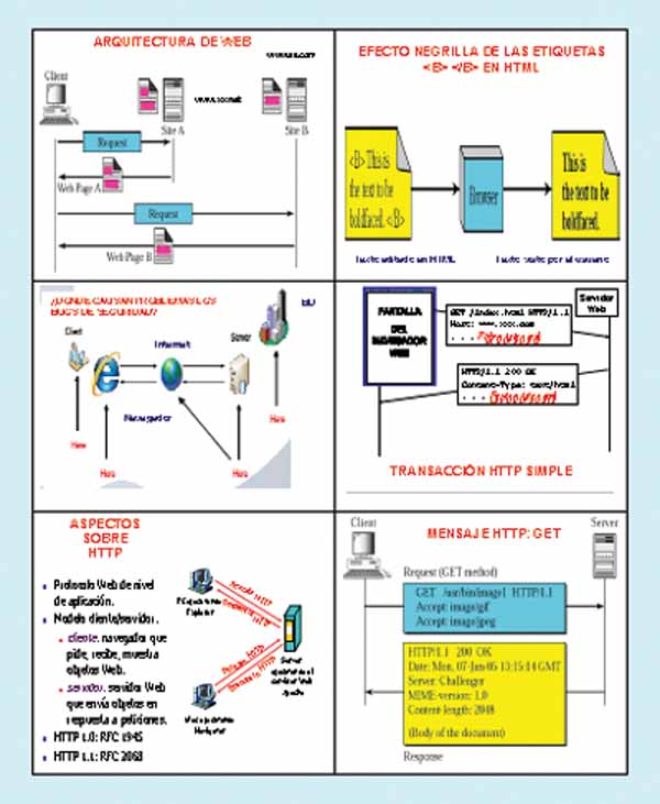 Las versiones de HTTP son: (i) HTTP 1.0 (RFC 1945). Es un protocolo de parada y espera. Utiliza una conexión TCP separada para cada fichero. El establecimiento y liberación de la conexión ocurre para cada fichero. Se caracteriza por un uso ineficiente de paquetes. El servidor debe mantener muchas conexiones durante el TIME_WAIT. Los clientes hacen peticiones al puerto 80 de los servidores Web, utilizan DNS para resolver el nombre del servidor en dirección IP. Los clientes hacen conexión TCP separada para cada URL. Algunos navegadores abren múltiples conexiones TCP (Netscape cuatro por defecto). El servidor devuelve la página HTML. Existen muchos tipos de servidores con una variedad de implementaciones. El servidor Apache es el más utilizado, disponible gratuitamente. El navegador interpreta la página y pide objetos embebidos. (ii) HTTP 1.1 (RFC 2068). Presenta mayor rendimiento, utiliza conexiones persistentes, pipelining, opciones de caché y soporta compresión. Las conexiones persistentes utilizan la misma conexión TCP para transferir múltiples ficheros. Reduce el tráfico de paquetes de forma significativa y puede o no incrementar el rendimiento desde la perspectiva del cliente si la carga en el servidor aumenta. El pipelining consiste en empaquetar tantos datos en un paquete como sea posible. Requiere campo(s) de longitud dentro de la cabecera HTTP. Puede o no reducir el tráfico de paquetes o incrementar el rendimiento. En este caso la estructura de la página es crítica. (b) Los lenguajes como HTML (Hyper Text Markup Language) y XML (eXtensible Markup Language). HTML es un subconjunto de SGML (Standardized General Markup Language) facilita un entorno con enlaces embebidos a otros documentos y aplicaciones. Los documentos HTML utilizan elementos para identificar secciones de texto de diferente propósito o visualizar características, por ejemplo letra en negrilla. Los elementos de marcaje no los ve el usuario cuando se visualiza la página. Los documentos son presentados por navegadores. No todos los documentos de la Web son HTML y los desarrolladores utilizan editores WYSIWYG para generar HTML. (c) Mecanismo de nombres con URIs (Uniform Resource Identifiers).