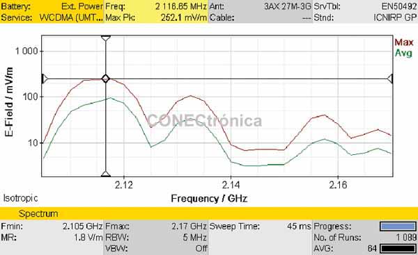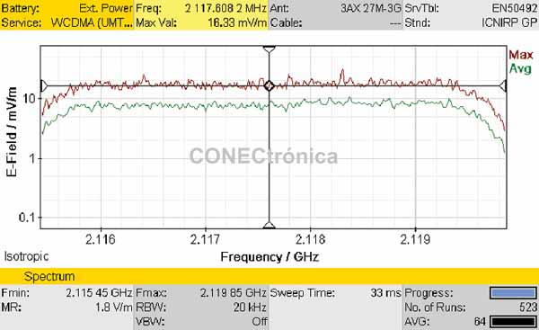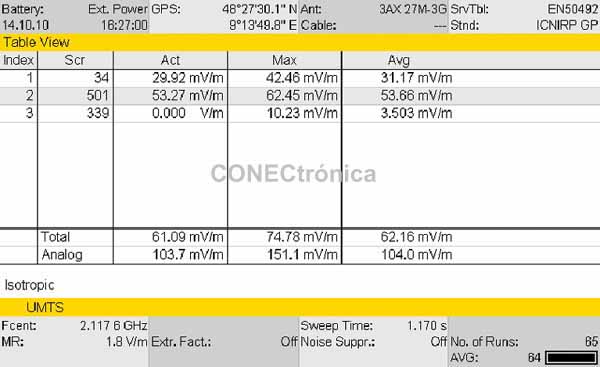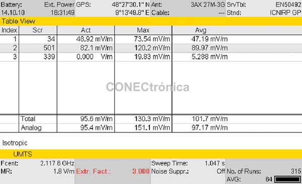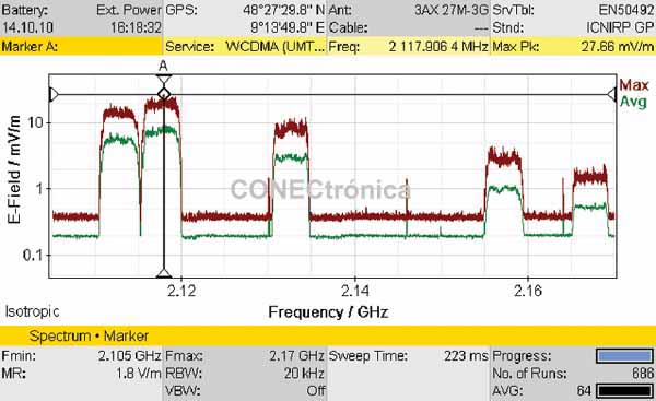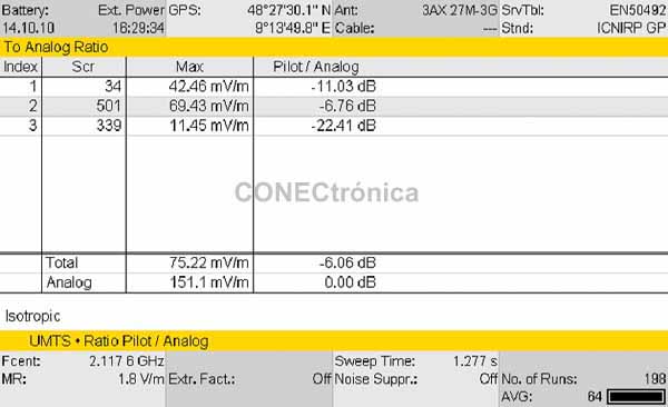 El SRM-3006 también muestra el valor analógico medido, que corresponde a la exposición real del campo, integrado sobre un canal de 5 MHz UMTS. La facilidad de cambiar de análisis espectral al modo UMTS P-CPICH Demodulación abre algunas características útiles. He aquí algunos ejemplos.