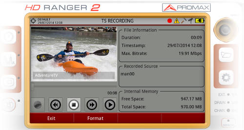 Esta utilidad graba en tiempo real los transport stream recibidos por cualquiera de sus entradas: RF, IP o ASI, por ejemplo un canal de la TDT. La grabación se almacena en una memoria interna dedicada de 1 GB. Posteriormente, la grabación se puede reproducir en el propio equipo como si fuese una señal recibida en directo.
