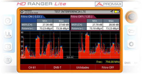 La utilidad medida de interferencia para LTE muestra el espectro de la banda LTE-800 (776-876 MHz) para conocer el nivel de actividad 4G (LTE) que hay. En la pantalla se muestran simultáneamente las medidas de potencia de la banda LTE y MER del canal que sospechamos que está siendo interferido sin filtro y con filtro. Si al colocar el filtro LTE el MER mejora, queda evidente el efecto nocivo de la interferencia de la señal 4G (LTE) sobre ese canal. De lo contrario, podemos descartar la señal LTE como fuente interferente.