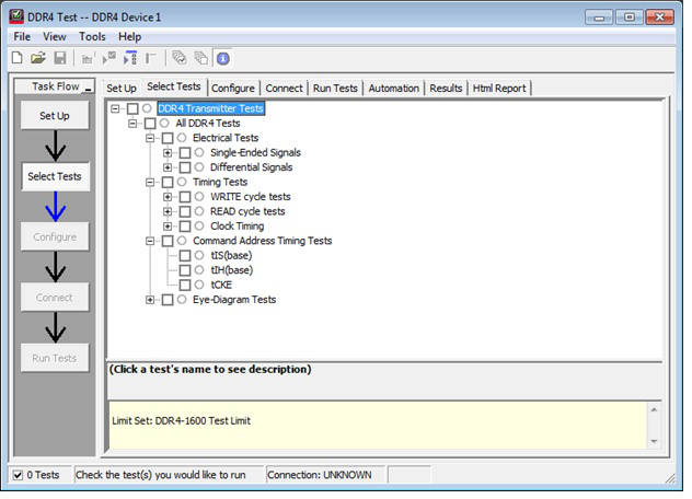 En la figura 1 se muestra un ejemplo de un paquete de software que expone las pruebas disponibles definidas en el estándar relativo a la memoria de un ordenador DDR4. El cliente selecciona las pruebas de interés y las medidas, y los algoritmos apropiados son implementados por el software automatizado del proveedor del osciloscopio. Es importante buscar un proveedor de osciloscopios que ofrezca coherencia en todo su software de medida basado en estándares. Un paquete de prueba de software de DDR4 debe mantener la coherencia con uno para PCI Express, lo cual incrementa la eficiencia y productividad del usuario final.