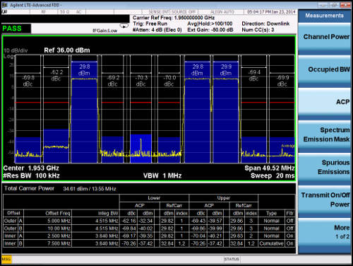 Asimismo, la aplicación de medida es compatible con medidas del factor de fugas del canal adyacente acumulado (CACLR) y de la máscara de emisión del espectro (SEM) acumulada para agregación de portadoras no contiguas intrabanda, un nuevo requisito de la versión 11 del 3GPP. La configuración no contigua intrabanda conlleva desafíos únicos en las medidas de RF de emisiones no deseadas, puesto que otro operador puede desplegar el espectro dentro del intervalo entre subbloques. La nueva medida del requisito de CACLR y la exclusiva máscara especial para la SEM mide las contribuciones de las portadoras a ambos lados del intervalo de subbloques. La nueva aplicación de medida de LTE-Advanced es la única solución del mercado que incorpora tanto CACLR como una máscara especial para la SEM para agregación de portadoras no contiguas.