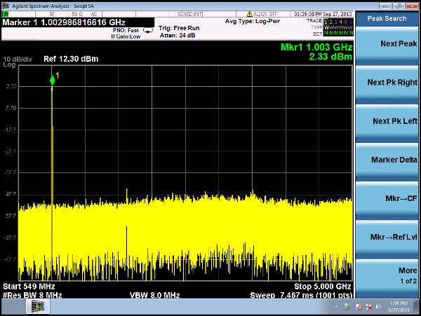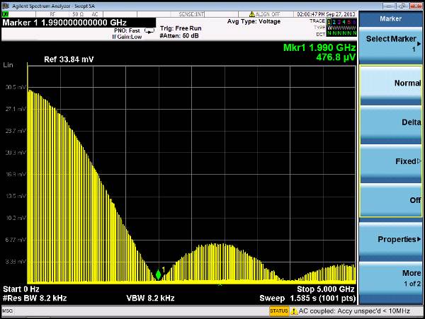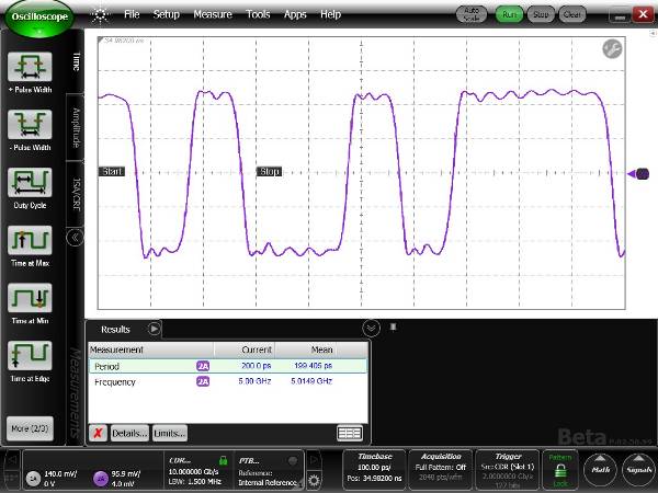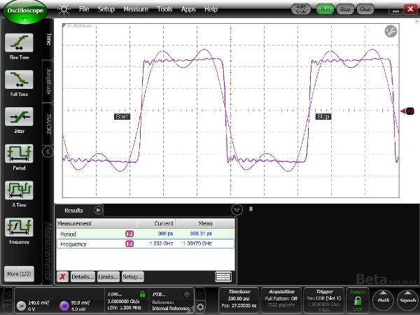 La Figura 3 muestra el efecto de hacer pasar la onda cuadrada a través del filtro de paso bajo. Observe que el tiempo de subida y el tiempo de bajada de los flancos se han ralentizado. Asimismo, se producen algunos picos y algunas caídas en las partes superiores e inferiores de los pulsos. De hecho, la señal se parece mucho a una onda sinusoidal rápida (el tono de 3 GHz) superpuesta a una onda más lenta (el tono de 1 GHz). El filtro hace lo que se espera de él.