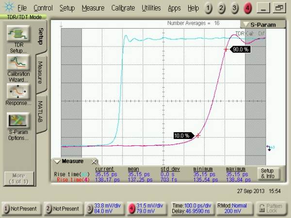 Una técnica diferente pero relacionada para caracterizar un canal consiste en inyectar un pulso de paso muy rápido en el canal y observar el pulso en la salida utilizando un osciloscopio con amplio ancho de banda. La comparación entre la salida y la entrada indica cómo degradará un canal los bits digitales. Esta técnica se conoce como transmisión en el dominio del tiempo o TDT. La Figura 5 muestra la respuesta de TDT del canal que se ha medido previamente con el analizador de redes de la Figura 4. La señal de entrada está representada por la traza azul. El paso, después de haber atravesado la placa de PC, se muestra con la traza roja. (El retardo de tiempo real entre la entrada y la salida se reduce para facilitar la comparación de los cambios en la velocidad de los flancos). No es la respuesta al impulso del canal, sino la respuesta al paso. Sin embargo, se pueden observar resultados parecidos. Si el canal fuera ideal, el paso de salida sería idéntico al de entrada, pero con un retardo en el tiempo debido a la longitud de la trayectoria del canal. Sin embargo, al igual que sucede con la respuesta al impulso, la atenuación de las altas frecuencias del canal ralentiza la velocidad de los flancos. ¿Por qué? Porque el canal ha atenuado los componentes de alta frecuencia de la señal necesarios para conseguir un flanco rápido.