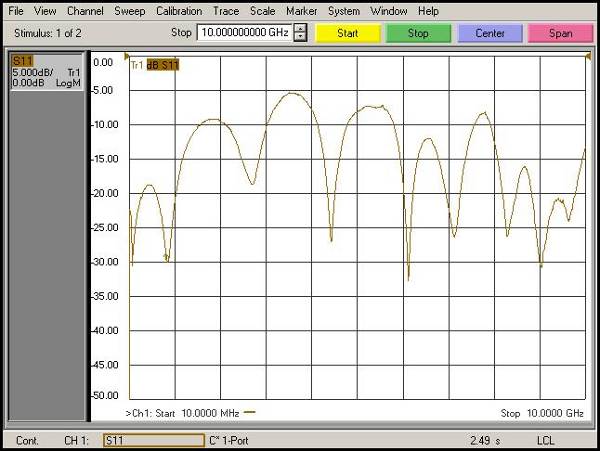 El eje vertical del analizador de redes está en decibelios. En el peor de los casos, la potencia de la señal reflejada es 5 dB inferior a la señal transmitida, es decir, alrededor de un 32% de la señal transmitida. La tensión reflejada, en realidad, es más de un 50% superior a la señal transmitida original. Esto se produce cuando las señales de los dos lugares donde se producen los reflejos se combinan en fase. Mantener la impedancia es esencial para conseguir unas comunicaciones digitales con baja BER. En los casos en los que los dos reflejos se combinan fuera de fase, la potencia de la señal reflejada total es tan solo 30 dB (0,1%) inferior a la señal transmitida original. La tensión reflejada es un 3% de la original. La transformada de Fourier permite al analizador de redes mostrar la respuesta en el dominio del tiempo de un modo similar al del TDR, y permite al TDR mostrar la respuesta en el dominio de la frecuencia de un modo parecido al del analizador de redes.