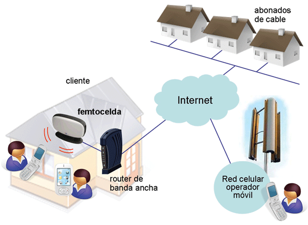 La arquitectura típica de una femtocelda se muestra en la figura 1. El equipo de radio, situado en el domicilio del cliente, es muy similar al de un punto de acceso Wi-Fi y está preparado para ser instalado fácilmente. Una conexión Ethernet permite conectar el equipo con un módem ADSL o de cable para enlazar con la red celular del operador a través de la conexión a Internet del abonado. De este modo, el operador consigue extender el alcance de su red en el interior del edificio aprovechándose de la conexión a Internet del cliente, mientras que este último se beneficia de una mejor calidad de las comunicaciones con unos costes más reducidos. Se trata pues de un claro ejemplo de convergencia fijo-móvil, donde a diferencia de otras arquitecturas, en este caso no se requiere ningún terminal dual sino que pueden utilizarse los mismos teléfonos 3G de que se dispone.
