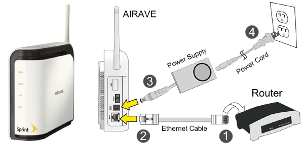 Podemos decir que Sprint es la compañía que ha implantado el servicio de las femtoceldas de forma más satisfactoria. Su servicio, llamado Airave, se está usando ya en multitud de hogares de los Estados Unidos. El dispositivo, fabricado por Samsung, cuesta del orden de 100 dólares que se repercuten directamente sobre el abonado final, aunque la compañía ofrece planes de llamadas que permiten un importante ahorro en la factura mensual. En la figura 2 se muestra una fotografía del dispositivo junto con un esquema que permite apreciar la sencillez de su instalación por parte del abonado.