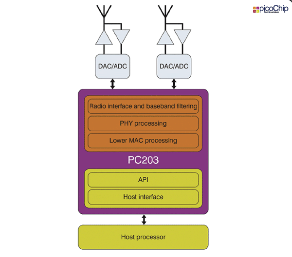 Hasta el momento nos hemos centrado en el caso de las femtoceldas 3G, si bien no es la única opción. Por ejemplo, el operador americano Comcast prevé desplegar femtoceldas WiMAX en el segundo semestre de 2009. Los equipos se utilizarán igualmente para extender la cobertura en el interior de los edificios, al tiempo que enrutar las llamadas VoIP sobre la red de cable del operador. Dado que el operador ofrece servicios de HDTV, VoIP e Internet de banda ancha (triple-play), en este caso la femtocelda WiMAX permite ofrecer movilidad en el hogar. El fabricante de chips picoChip dispone de toda una serie de módulos de referencia configurables por software para el desarrollo de femtoceldas 3G y WiMAX. En este último caso, el diseño de referencia PC8530 proporciona la implementación IEEE 802.16e OFDMA PHY y MAC inferior (figura 5). Este diseño puede actualizarse al PC8532 para soportar WiMAX Wave 2 y IO-MIMO.