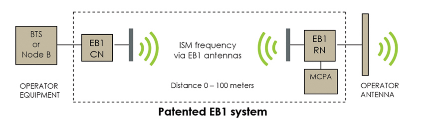 La tecnología patentada de E-Blink consiste en un acoplamiento ISM inalámbrico entre las antenas de la estación base y su equipo de radio. Disponible para las frecuencias de funcionamiento 2G y 3G, el sistema EB1 se puede utilizar para potenciar sitios existentes así como para nuevas instalaciones. EB1 provee a los operadores móviles de una solución más práctica y de alto rendimiento para todos los tipos de enclaves BTS. Ofrece mayor flexibilidad y ahorro en costes de despliegue, mientras que asegura una mejor integración del equipo en los alrededores de la estación base.