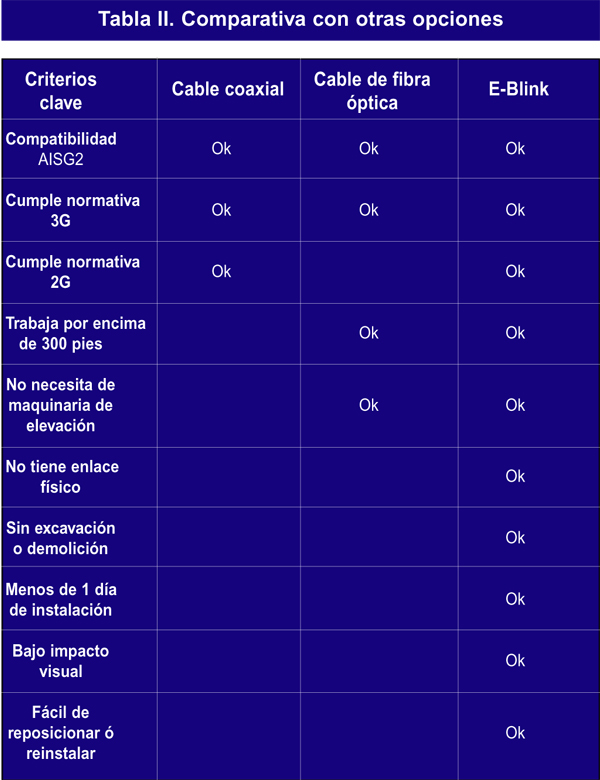 Generalmente, las torres de telecomunicación ya están instaladas (figura 5) y se han diseñado para apoyar cierto peso de la cabeza del mástil para las antenas y el cable. Potenciar estos sitios es a menudo problemático, puesto que implica instalaciones adicionales de las antenas y del cable más pesados. El refuerzo de los cimientos o de los mástiles y direccionar el cable pueden ser costoso en términos de negociaciones, propuestas y construcción. E-Blink es óptimo para este tipo de mejoras, si el enclave del BTS está en un campo abierto o en un edificio.