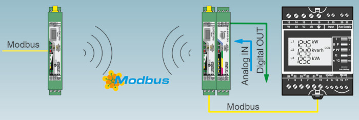 Mediante este modo dual ahora es posible transmitir información de una estación de medición serie y simultáneamente otros datos de E/S. Estos pueden ser por ejemplo contactos de puerta o señales de alarma de sensores pasivos. Donde antes se necesitaba una ruta de comunicación paralela o una estación Modbus/RTU adicional, ahora puede accederse a la función de E/S del sistema Radioline.